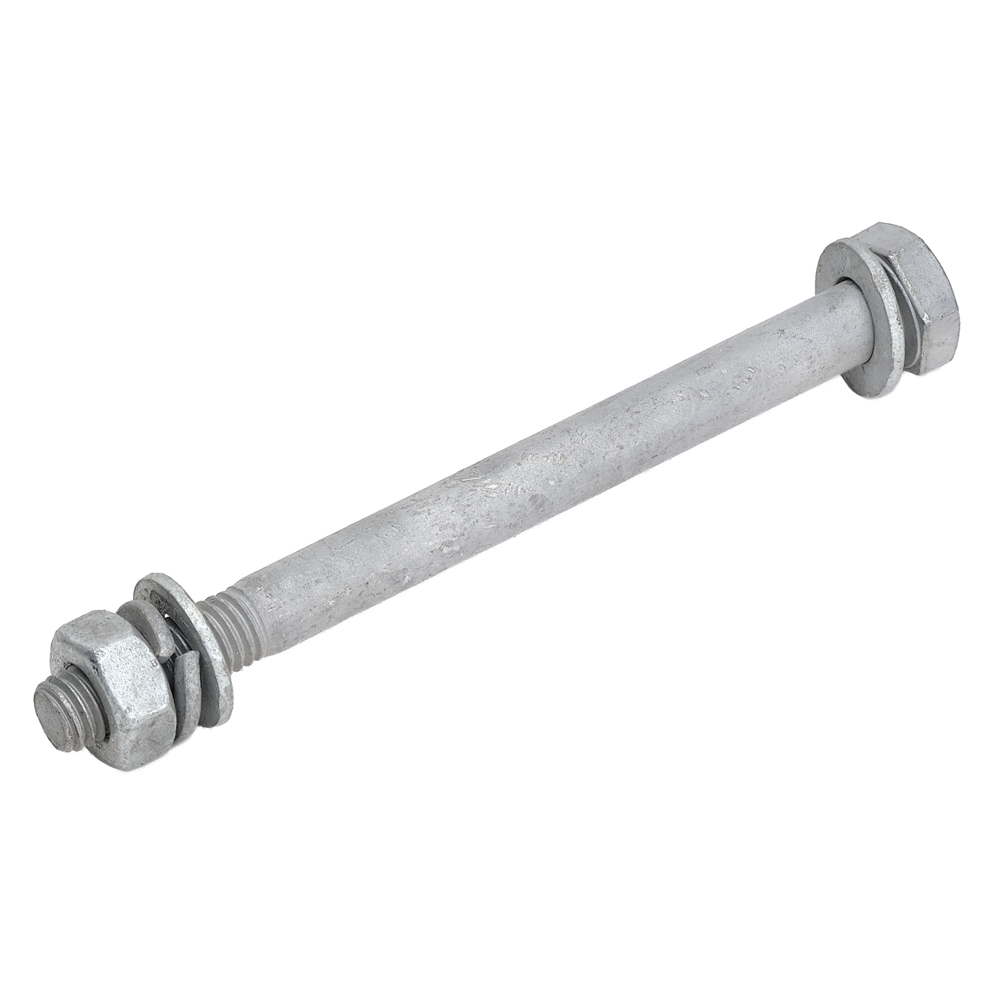 Heitgalvanhúðan sett með 10mm skrúfbolti, 12cm langur með tveimur skinnum, spenniskinnu og ró.